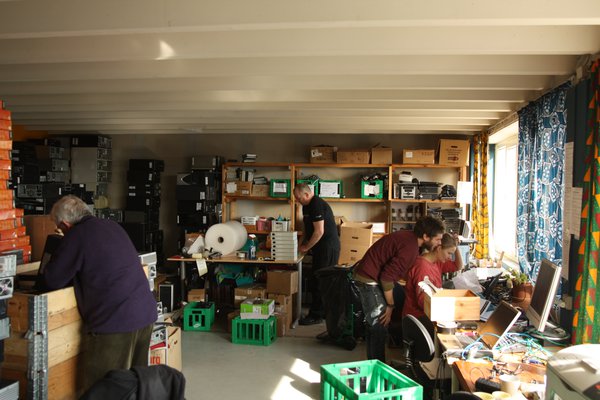 Vi har en masse skærme, som skal testes og pakkes. Derfor holder vi en arbejdsdag dedikeret til dette. Ideen er, at vi efter bedste Ford-model laver et samlebånd, hvor nogle tester, nogle pakker, nogle laver kaffe og andre snakker.